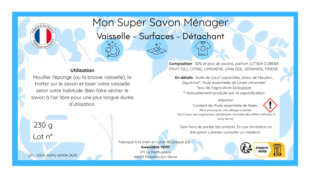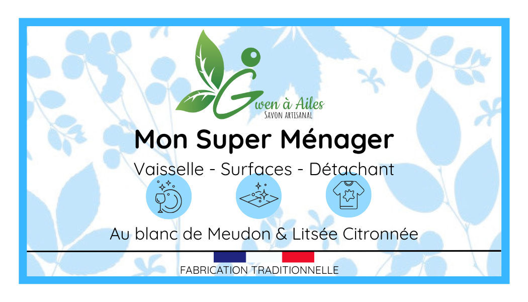 Découvrez "Mon Super Savon Ménager", le savon naturel et polyvalent qui révolutionne votre manière de faire le ménage. Conçu à partir d'ingrédients authentiques et respectueux, il combine efficacité, douceur et respect de l’environnement pour un nettoyage en profondeur sans compromis.